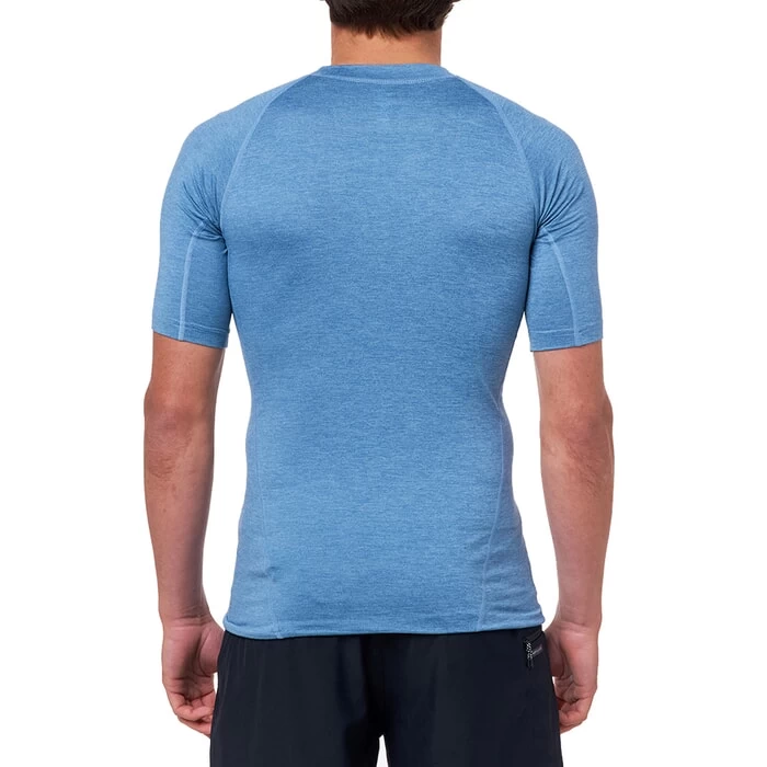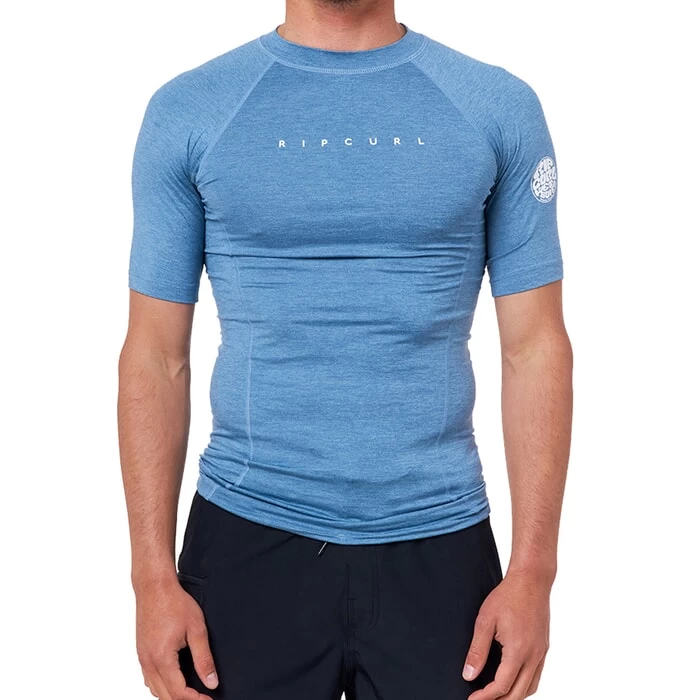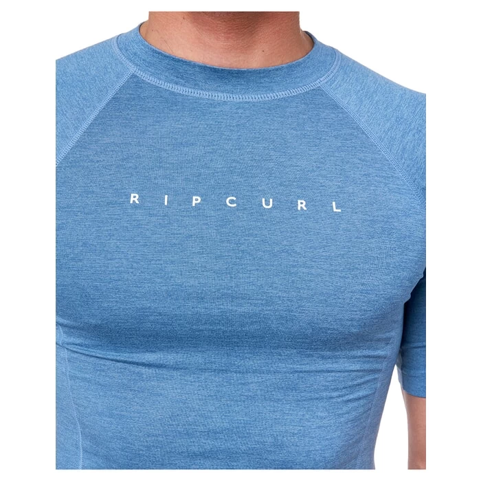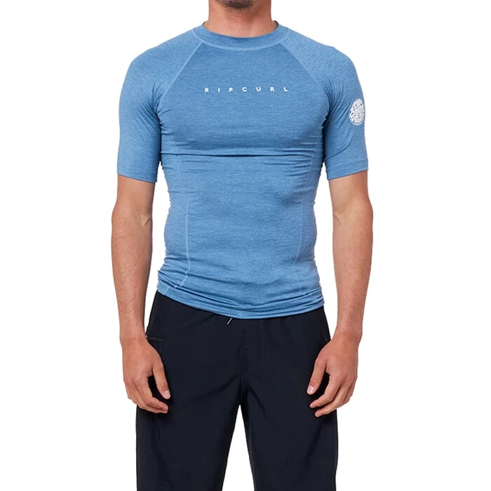 Wear a rash vest in the water to improve efficiency – add a layer of warmth or protect your skin from harmful sunrays. Rip Curl are known for their core surfwear – including rash guards. The Dawn Patrol short sleeve rash vest is perfect for beach or pool days and is not just for surfers. Clear Rip Curl branding features on the chest and arm and the elastic boardshort connector loop allows you to attach it to your swim shorts which stops it from riding up your body. The men’s blue rash vest is a performance fit – meaning that it’s meant to be tight fitting as this allows for greater efficiency whilst moving through the water.