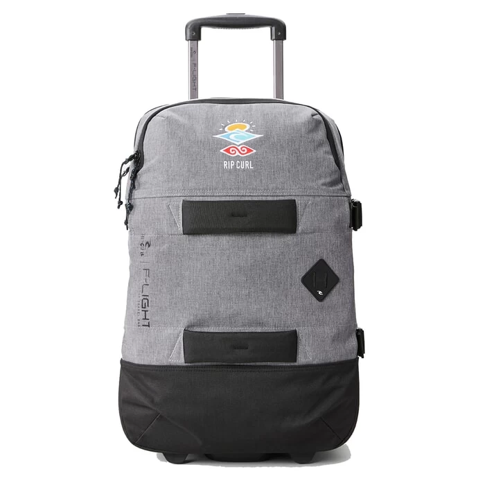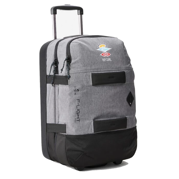 Rip Curl F-Light Transit 50L IOS wheeled luggage in grey marle features carry handles and compression straps as well as drawcord zip pulls – external pocket – internal mesh pocket – international cabin sized – lockable zips – sandwich construction and telescopic handle. Branding includes a Rip Curl faux leather patch and Rip Curl printed logo. Made with recycled fabric. Made from 100% recycled polyester and is 54cm high x 33cm wide x 24cm deep. Part of the Rip Curl F-Light range.