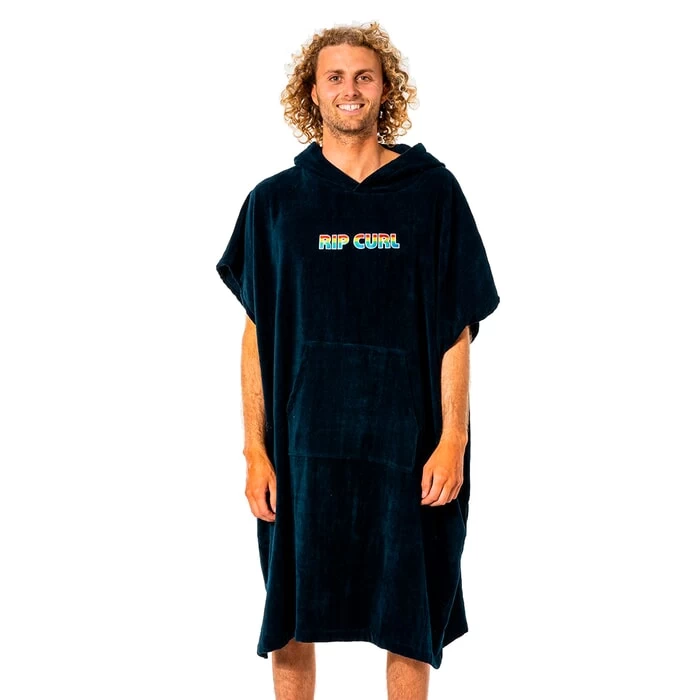 Rip Curl Icons changing robe in navy features a pouch pocket. Branding includes a Rip Curl embroidered logo. Made with terry cotton. Made from 100% cotton.