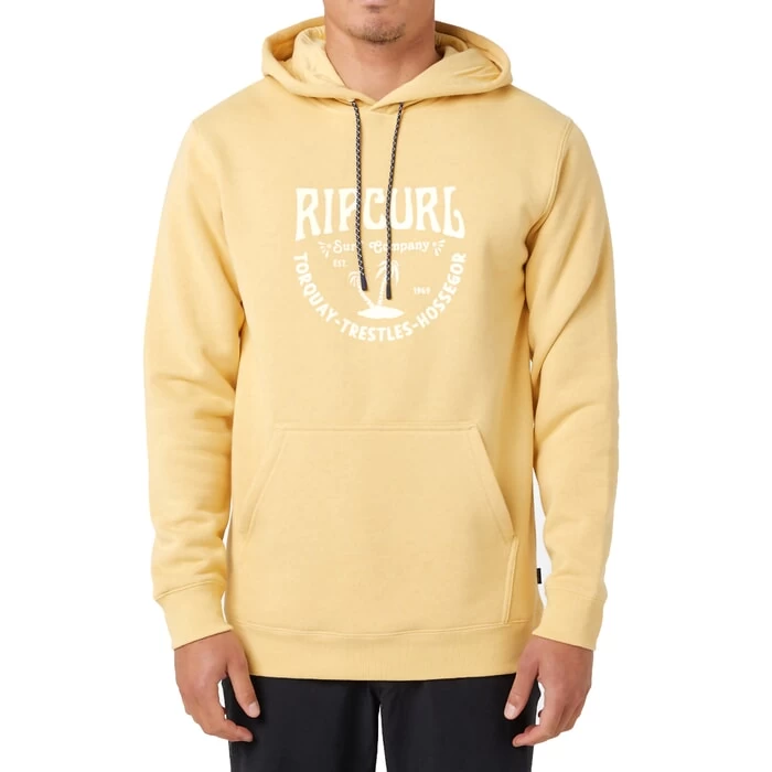Rip Curl Les Esta regular fit pullover hoody in washed yellow features a adjustable drawstring hood and chest print as well as pouch pocket. Branding includes a Rip Curl printed logo and Rip Curl woven label. Made with organic fabric. Made from 60% organic cotton and 40% polyester.