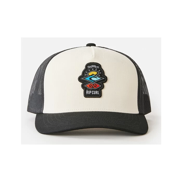 Rip Curl Search Icon trucker curved peak cap in black/white features a 5 panel design and adjustable popper strap as well as curved peak. Branding includes a Rip Curl embroidered patch and Rip Curl woven label. Made from 60% cotton and 40% polyester. Part of the Rip Curl Icons of Surf range.