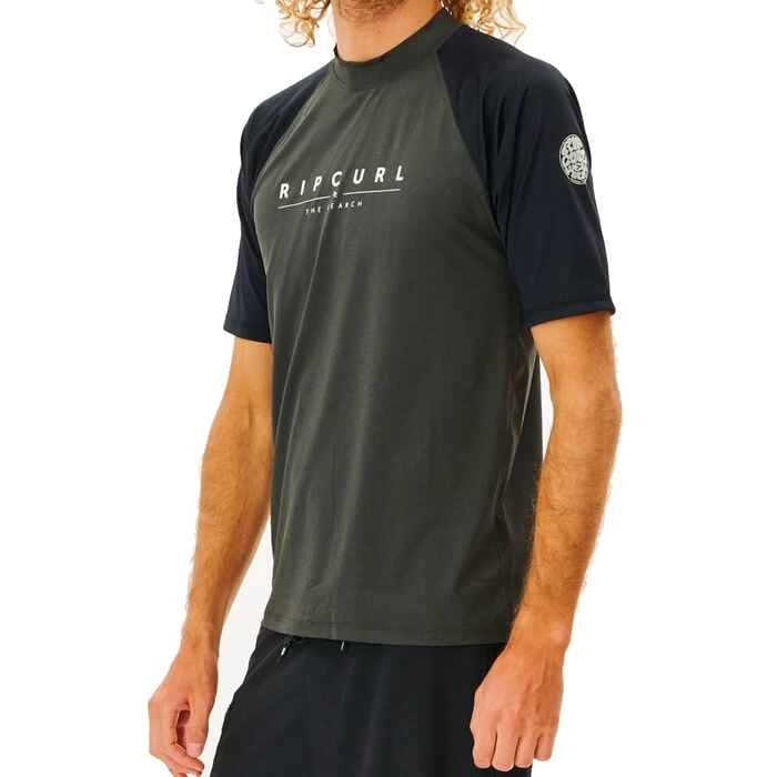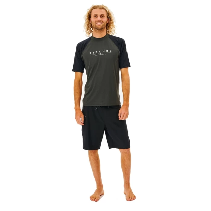 Rip Curl Shockwaves short sleeve rash vest in black marled features a boardshort connector loop and chest print as well as sleeve print and UPF 50+. Branding includes a Rip Curl woven label. Made from 92% polyester and 8% elastane.