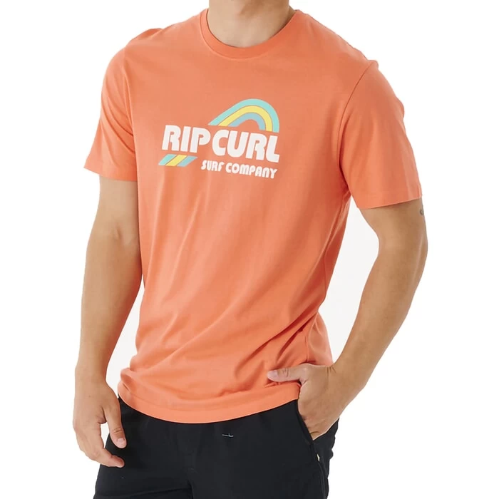 Rip Curl Surf Revival Waving regular fit short sleeve t-shirt in peach features a chest print. Branding includes a Rip Curl woven label. Made with cotton jersey. Made from 100% cotton. Part of the Rip Curl Surf Revival range.