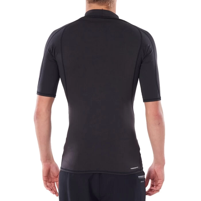 Rip Curl Thermopro short sleeve rash vest in black features a boardshort connector loop and UPF 50+. Branding includes a Rip Curl logo chest print and Rip Curl woven label. Made with upf+ material. Made from 94% polyamide and 6% elastane.