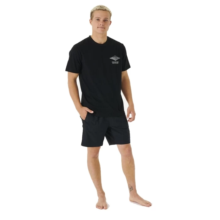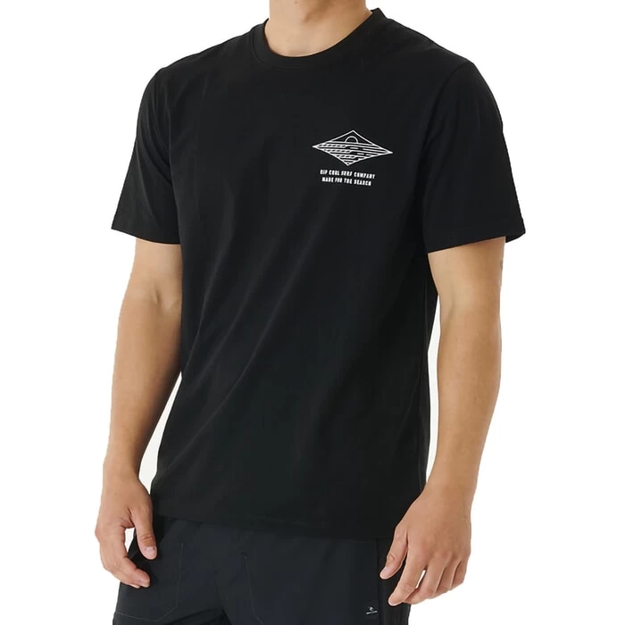 Rip Curl Vaporcool Line Up relaxed fit short sleeve t-shirt in black features Rip Curl Vaporcool fabric. Also features a chest print and rear print. Branding includes a Rip Curl logo chest print. Made with moisture wicking fabric. Made from 60% cotton and 40% polyester.
