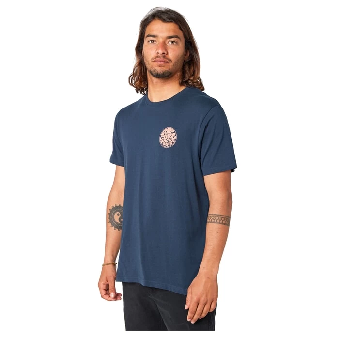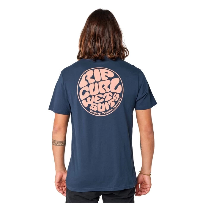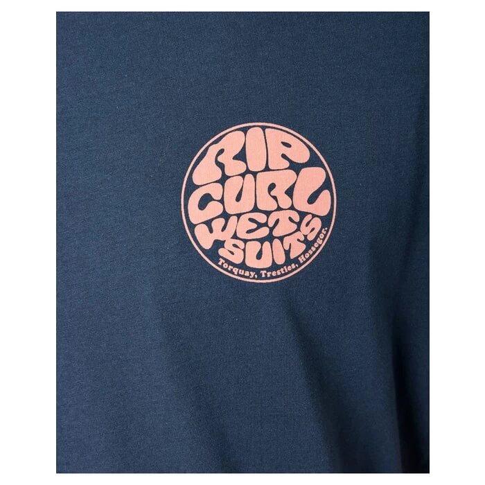 Rip Curl Wetsuit Icon regular fit short sleeve t-shirt in dark navy features a eco aware manufacture and rear print. Branding includes a Rip Curl logo chest print and Rip Curl woven label. Made with organic fabric. Made from 100% organic cotton. Part of the Rip Curl Icons of Surf range.